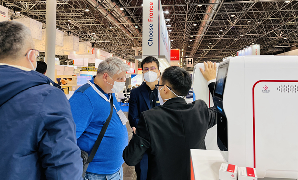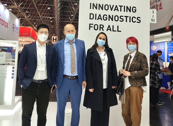 在经过同行推荐并使用了zoty中欧产品后,一位从事检测工作十多年的苏丹客户专门找到zoty中欧展台,进一步了解zoty中欧新冠和其他试剂检测业务。看完zoty中欧方案的操作后,他频频点头并表示,“你们的方案应用场景广、操作简便、精准可及,我非常看好你们!”